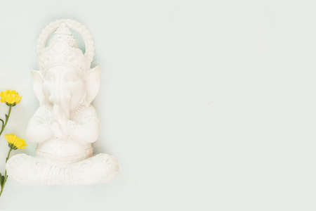 Sculpture of Lord Ganesha with flowers on a light blue background with copy space. Holiday of Ganesh Chaturthi. Ganesh Festival. Hindu religion holidays. flat lay