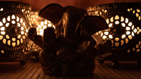 Golden ganesha figure with warm candle light. Closeup of golden elephant with oriental candles. Buddhist concept