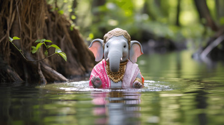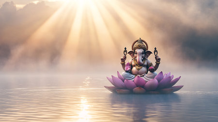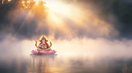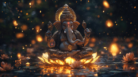 A stunning representation of the Hindu deity Ganesh, adorned with intricate details and surrounded by floating lotus flowers, radiates peace and spirituality in a tranquil setting.