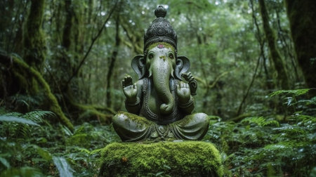 Generative AI : ganesha deity stone statue on the foot of a dead tree in a fores