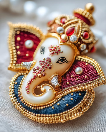 Intricately decorated Lord Ganesha pendant with gold, pearls, and red embellishments on a textured fabric background
