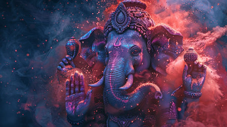 Lavish Ganesha Sculpture in Vibrant Hindu Style, Embellished with Opulent Details and Enveloped by Swirling Smoke on Dark Canvas