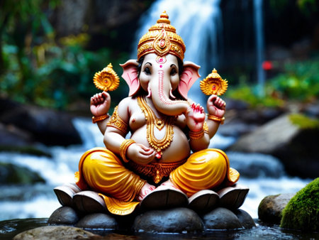 Ganesha statue with beautiful waterfall background, Happy Ganesha Festival