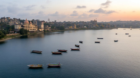 Scenic River Sunset Boats Cityscape India Calm Water View sky day asia town peace urban drone image