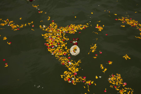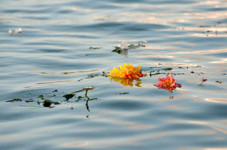 Hinduism religious ceremony puja flowers and candle on the sacred river Ganges water in Rishikesh, India, close up