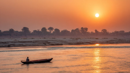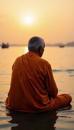 At sunset, a devoted monk sits in quiet contemplation along the Ganges River in Varanasi. The golden hues of the sky reflect on the water, enhancing the atmosphere of peace and spirituality.