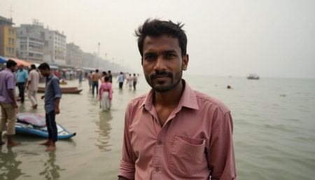 In Varanasi, a man gazes thoughtfully at the camera while the Ganges gently laps at the shore.