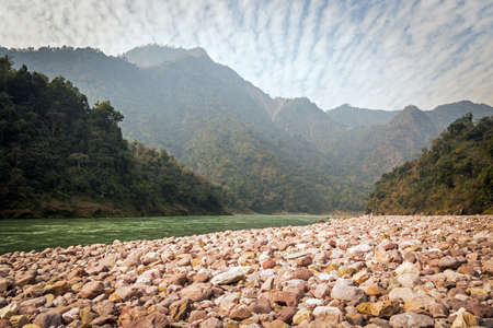Beautiful mountain landscape in Himalayas, Uttarakhand, India. Sunny day of summer. Big mountain, blue Ganges river and fresh air. Eco travel. feathery clouds in the shape of stripes on the blue sky