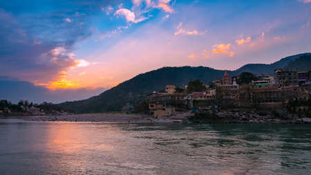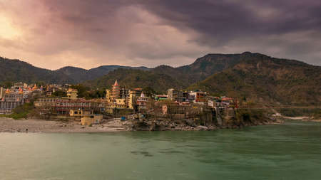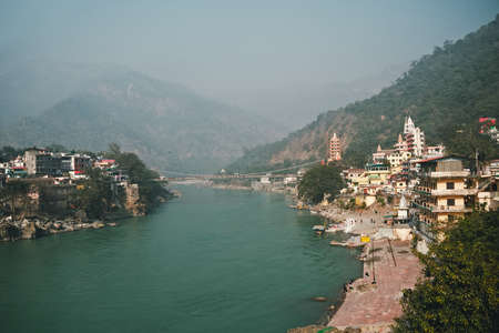Panorama view of the Holy Ganges river that flows through Rishikesh - the holy city for the Hindus, India. Shoot from Bridge Laxman Jhula.