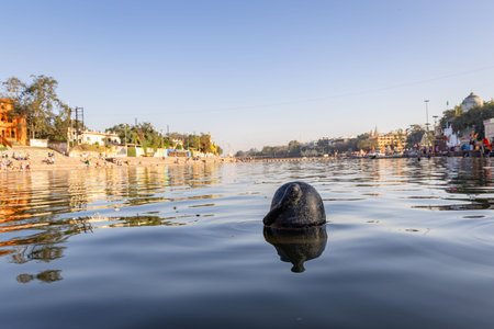 holy stone at Shipra river shore with bright blue sky at morning