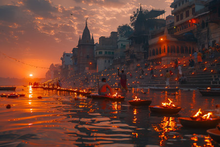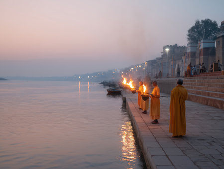 Hindu priests in traditional robes are performing a sacred aarthi ritual with fire lamps at dawn, standing on the ancient ghats along the holy ganges river in varanasi, india