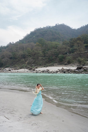 A girl in a blue dress walks on the beach near the Ganges. Rishikesh, India.