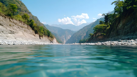 A captivating river flows serenely between steep, green canyons under a bright blue sky with fluffy clouds. The atmosphere is peaceful, with natural beauty reflecting relaxation.