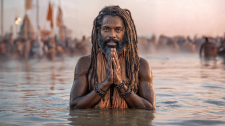 Hindu man in a namaste pose along the scenic ganges river at the vibrant kumbh mela festival, evoking sacred rituals and rich cultural heritage.