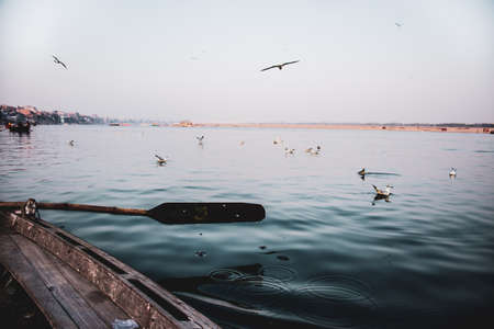 Varanasi, India - October 10, 2010: Boat and boatman on the Ganges with people bathing on the ghats