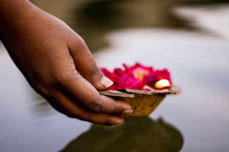 Hand of indian man holding a candle and floating in water.