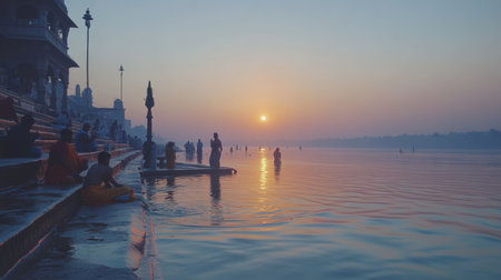 Silhouettes of people performing spiritual bathing rituals in the Ganges River at sunrise, with ancient architecture and misty atmosphere.