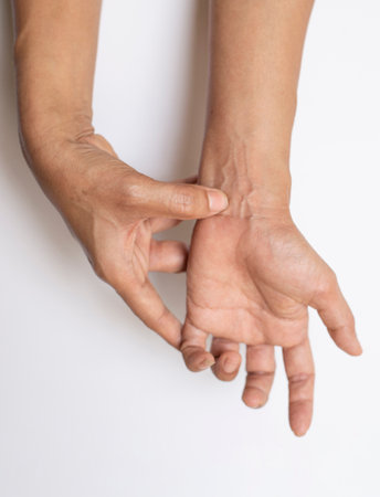 Woman pain at wrist, arm and hand ,take the pulse