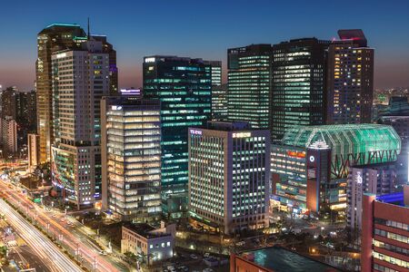 SEOUL, KOREA - MARCH, 2019: Twilight view of office buildings and traffic in Songpa-gu, Seoul