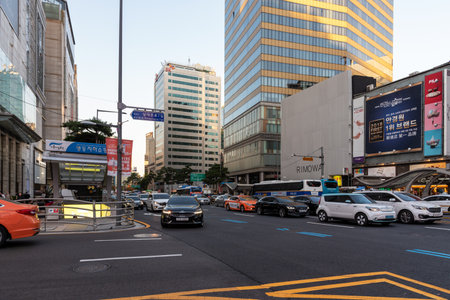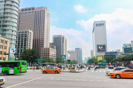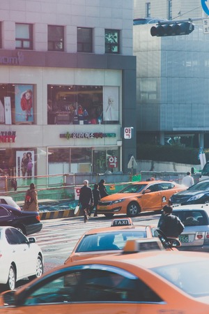 Seoul, South Korea - circa September 2015: Road traffic anc cars driving on the streets of Seoul, South Korea