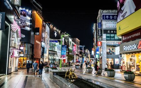 Busan Korea , 1 October 2019 : Gwangbok-dong Culture and Fashion shopping street view illuminated at night with people in Busan South Korea