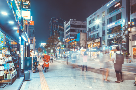 SEOUL, KOREA - AUGUST 12, 2015: People walking by opened stores at busy main street of Sinchon district at night - Seoul, South Korea