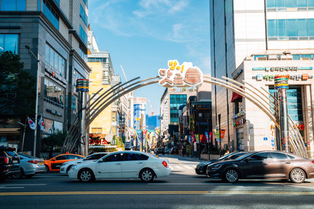 Seoul, South Korea - November 04, 2019: View of traffic at Myeongdong street in Seoul South Korea