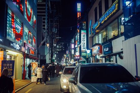 Seoul, South Korea - December 15, 2018: The night streets of Seoul never sleep. In the evening, thousands of different people walk there.