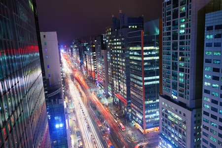 Traffic speeds through an intersection at night in Gangnam, Seoul in South Korea.