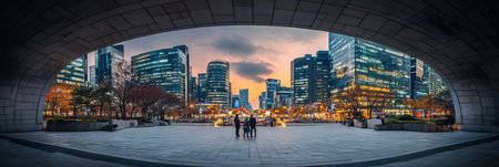 Sunset over futuristic cityscape of Seoul, South Korea, view from modern architectural tunnel.