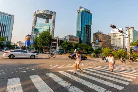 Seoul, South Korea - May 31, 2017: Pedestrians crossing the street in the downtown Seoul.