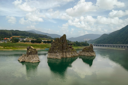 Mountain landscape with a lake and a bridge in the background, Stone Gate in South Korea