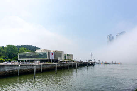 BUSAN,SOUTH KOREA - JULY 20, 2017: The large thick mist blow pass through skyscrapers in Haehundae, Busan, South Korea.