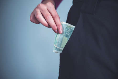 woman hand money on pocket on gray wall background