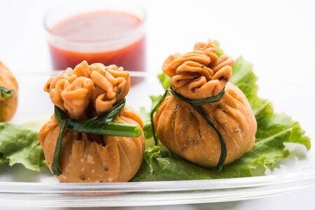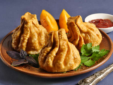 Nepalese Traditional Deep Fried Dumpling Momos served with Tomato Chutney, Schezwan sauce and Cabbage salad. Organic Food.