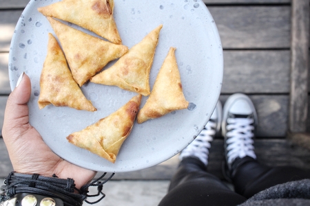 Selfie of samosa with hand
