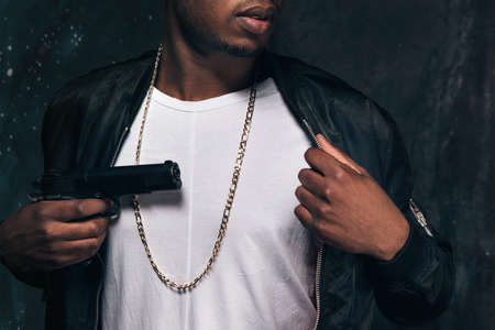 Unrecognizable black man threatens with a gun closeup studio shoot. Ghetto gangster with weapon on dark background. Outlaw, ghetto, murderer, robbery concept