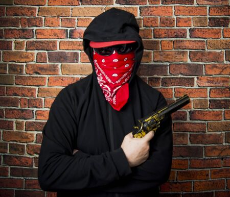 Hidden man with hood, scarf and gun in front of a brick wall