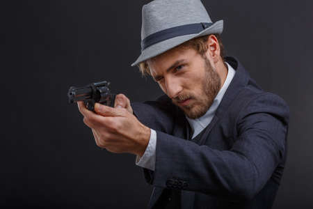 Gangster aims to hold the gun with both hands against close-up a gray background