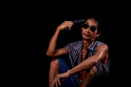The portrait slim old man put a gun to his head at the black background, Suicide of depressed men who kills himself by handgun