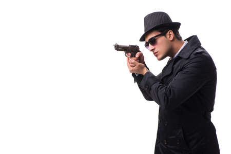 The man in a suit gun in the hands of the mafia emotions Agent light background