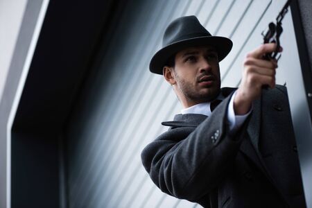 Low angle view of mafioso aiming gun with outstretched hand from corner on street