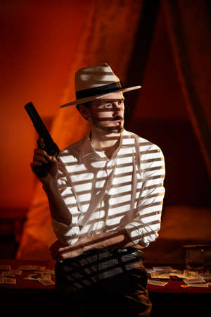 A handsome confident man stands with a gun in his hand, leaning on a table with banknotes and playing cards in a bedroom with dark lighting. Retro style. Mafia, gambling and the criminal world.