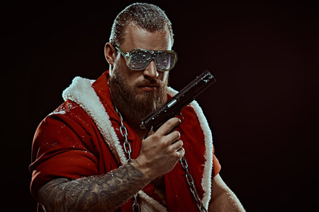 Christmas and New Year's action movie. Portrait of a brutal muscular Santa Claus in a red fur coat and sunglasses, who stands in combat readiness with a gun in his hand. Black background.
