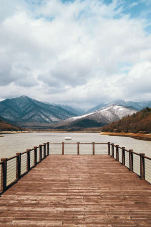 Wooden pier on a lake with mountains in the background. Landscape