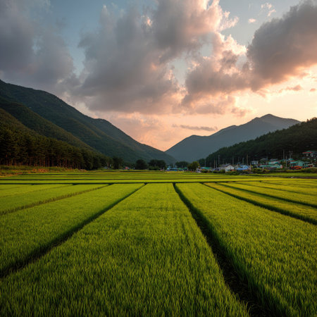 A vibrant landscape showcases vast green rice fields stretching towards distant mountains under a cloudy sky. The composition emphasizes depth, with parallel lines of crops leading the eye. The lighting suggests late afternoon or early evening. This image is suitable for various commercial purposes, including marketing or editorial content.