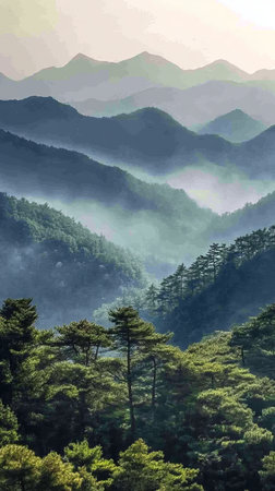 Misty mountain landscape with dense forest, tranquil nature in early morning light