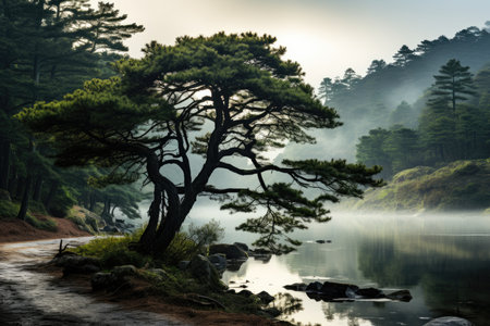 Pines wrapped in mysterious fog., generative AI