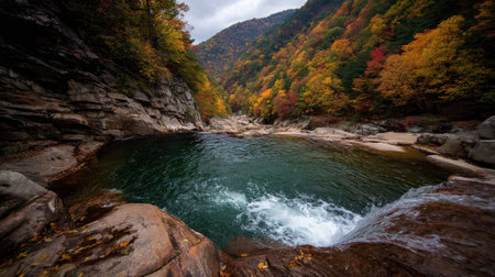 Mountain river in the autumn forest. Colorful autumn landscape.
