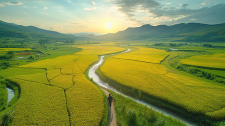 Beautiful Chinese idyllic panorama with rice fields and river at sunset